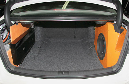 Поскольку заказчик требовал сделать максимально скрытой установку с сохранением объёма багажника, мы расположили сабвуфер Alpine SWR-1222D в правой боковине (кстати, из «закромов»), в корпусе порядка 25 литров, а чейнджер, усилители и процессор в левой боковине багажника. С задачей справились на отлично, ещё и решили дизайнерскую проблему облагородив автомобильные сабвуферы Alpine.