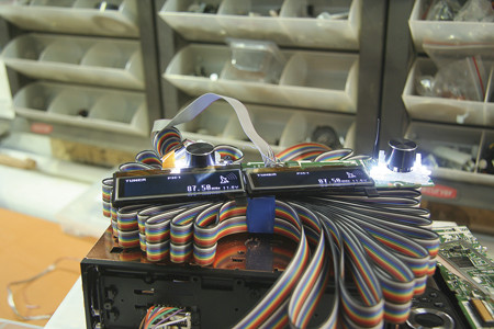 Куда установили экран, вы уже могли заметить. Экран и датчик пульта — на месте левого воздуховода в центральной панели, сколько необходимо воздуха в центральных воздуховодах после изменения их площади, оставим для климат-контроля. Для этого было изготовлено декоративное стекло, которое целиком повторяло оформление чёрных полированных вставок в салоне автомобиля. Подключить Pioneer решили к штатным кнопкам на рулевом колесе и FM-антенне, притом для сопряжения с рулевыми кнопками понадобилось сделать особый контроллер — ведь готовых ещё нет.