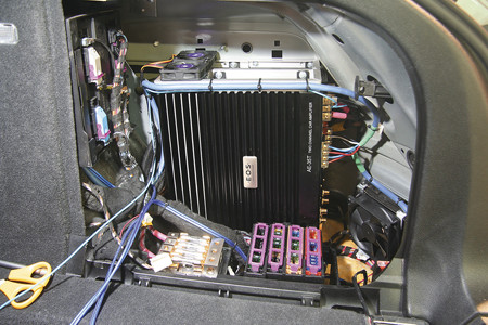 Чтобы работать с фронтальными и тыловыми мидбасами применяются два усилителя E.O.S. AE-35 Limited Edition. Твиттеры требуют — более аккуратного и «прозрачного» E.O.S. E-100AB, сабвуферы — мощный E.O.S. AE-620T. Все из четырех усилителя и сам Pioneer DEX-P99RS были умещены в правом крыле, что, в общем-то, оказалось непростым — места там маловато. Кроме этого, поскольку в правом заднем крыле по умолчанию расположены блоки предохранителей, то оба усилителя надо перемещать в пространстве, открывать доступ к лампочкам задних фонарей и предохранителям. Алюминиевая рама на петлях целиком решает задачу перемещения «усилков», а 4 бесшумных вентилятора все время отводят тепло от всей «усилительной семьи».